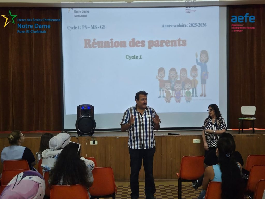 Lors d’une belle rencontre entre M. Antoine Mdawar, chef d’établissement, Mme Ghada Azar, directrice du Cycle 1, et les enseignantes, les parents ont découvert les grandes lignes du travail mené en classe et la méthodologie adoptée. Ce moment de partage a renforcé la complicité entre l’école et les familles, afin d’accompagner chaque enfant sur le chemin de l’épanouissement et de la réussite.